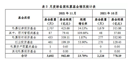 再从私募基金产品备案登记的情况看,11月基金业协会新备案私募基金数量3602只,较上月增加1376只,环比增长61.81%;新备案规模962.60亿元,较上月增加184.42亿元,环比增长23.70%。