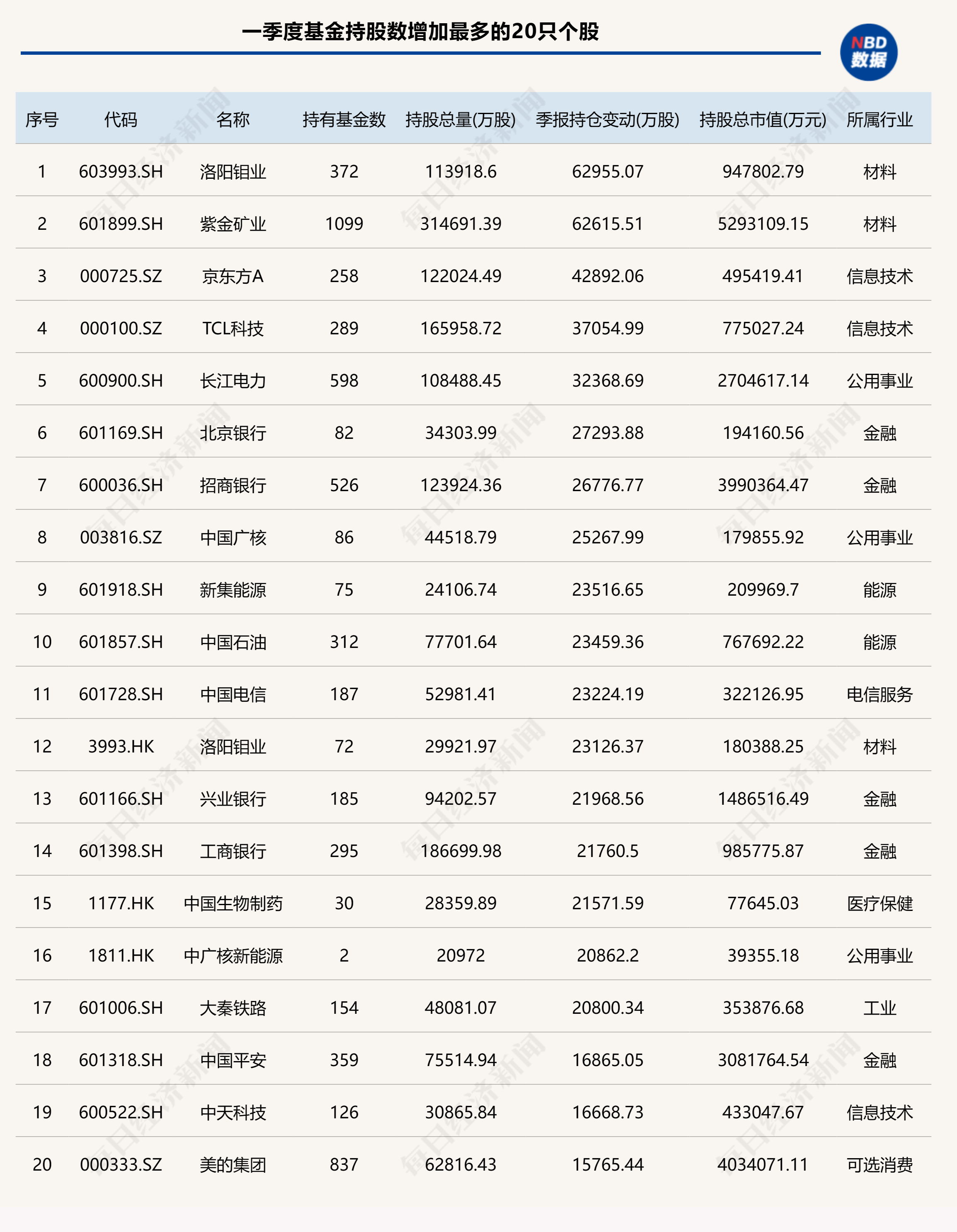再从基金的增持情况来看,wind数据显示,基金一季度持股数增加最明显的20只个股如下:
