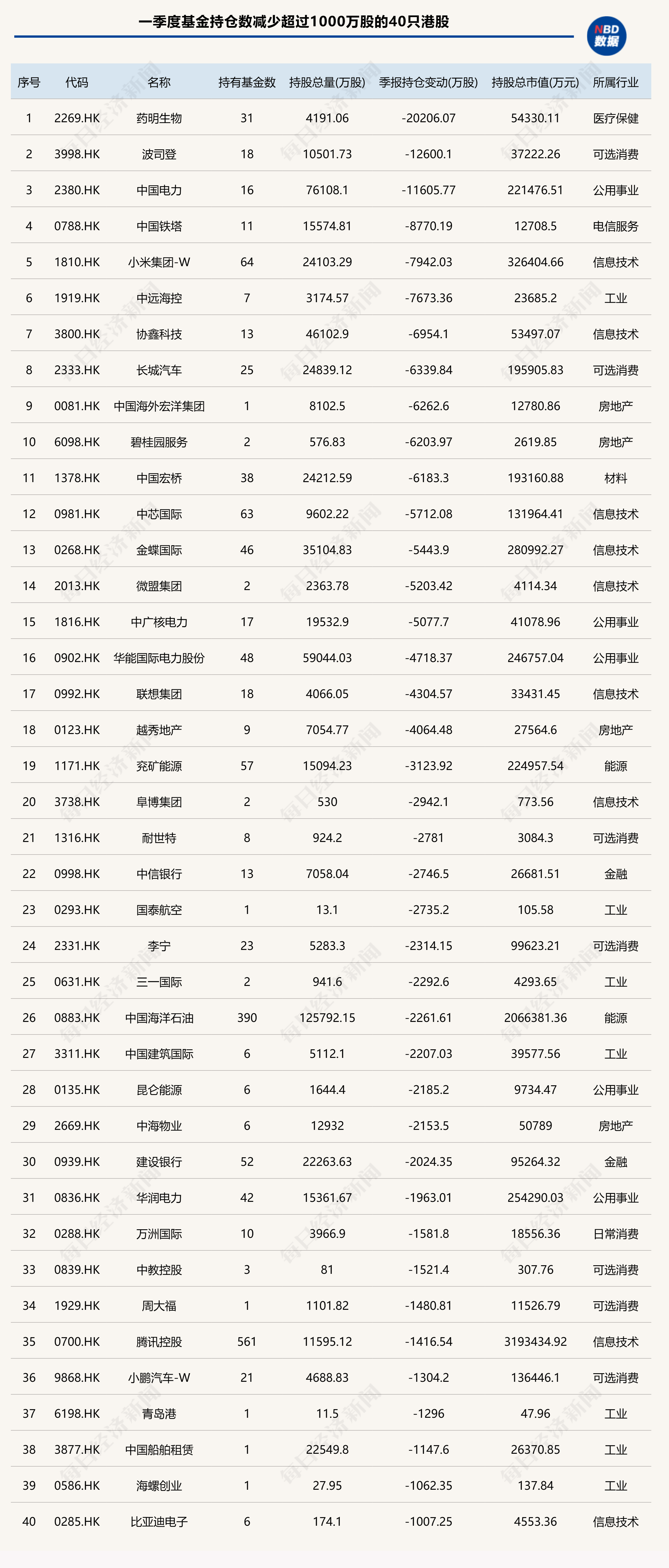 40只港股被基金减持超1000万股