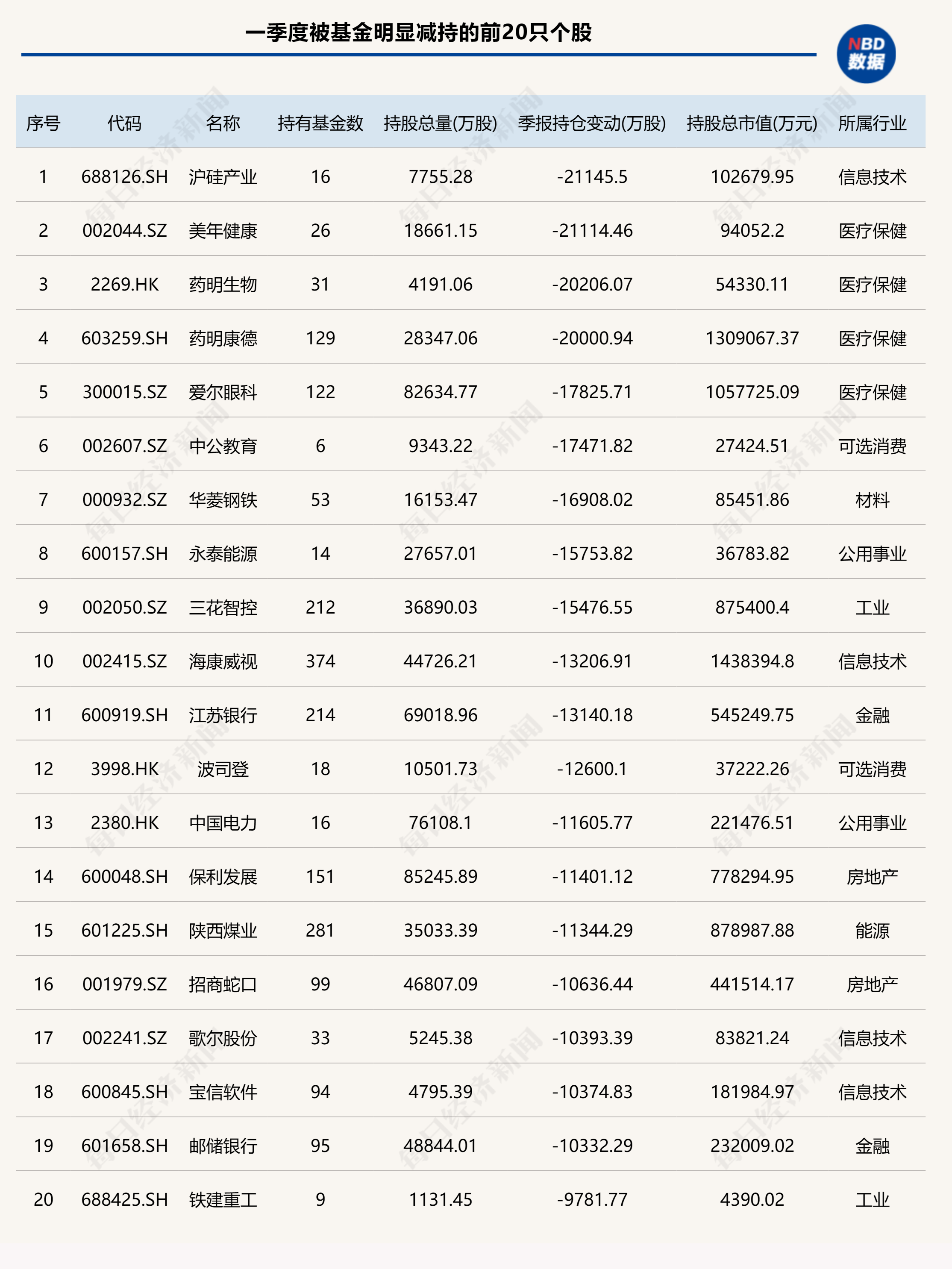 再来看基金在港股方面的增持和减持情况,一季度基金持仓数增加最为明显的前20只个股如下: